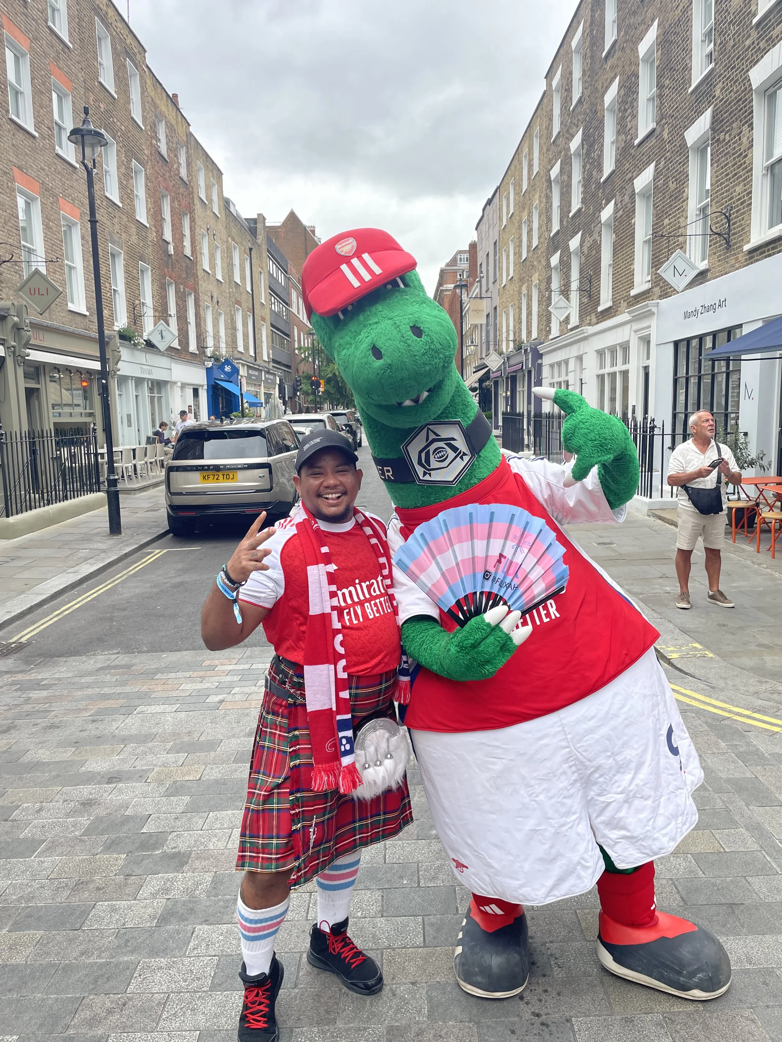 Sydney at London Pride 2025 with the Gunnersaurus.